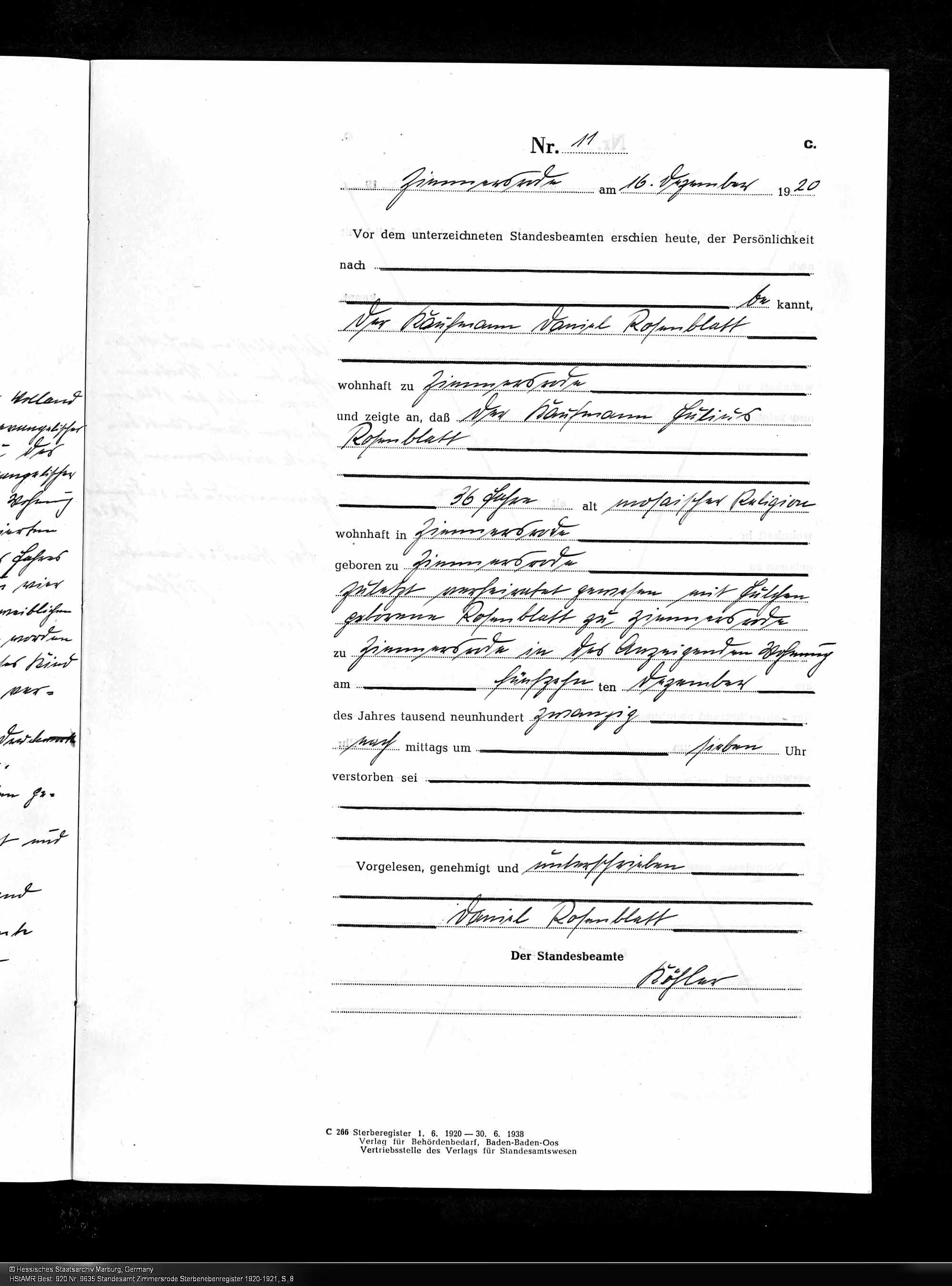 Juda Julius Rosenblatt death record, Hessisches Hauptstaatsarchiv; Wiesbaden, Deutschland; Personenstandsregister Sterberegister; Bestand: 9635; Laufende Nummer: 920, Year Range: 1920-1921, Ancestry.com. Hesse, Germany, Deaths, 1851-1958
