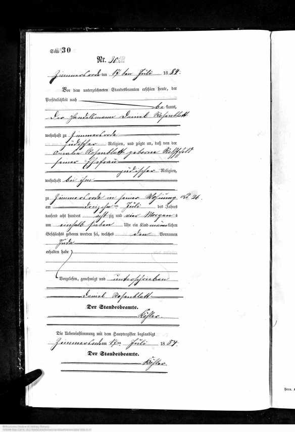 Juda Rosenblatt birth record, Hessisches Hauptstaatsarchiv; Wiesbaden, Deutschland; Bestand: 920; Laufende Nummer: 9522, Year Range: 1884, Ancestry.com. Hesse, Germany, Births, 1851-1901