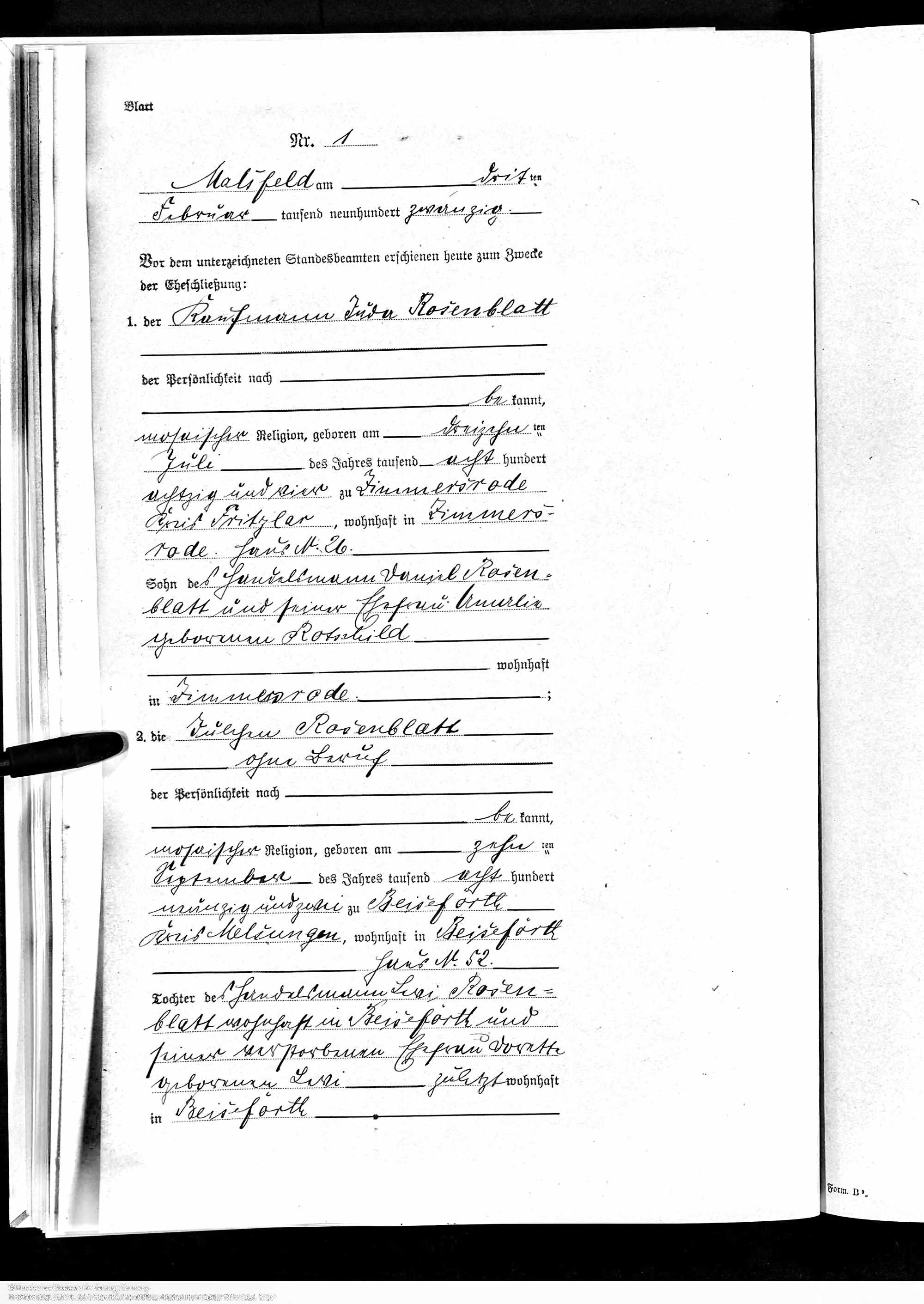 Juda Rosenblatt and Julchen Rosenblatt marriage record, Hessisches Hauptstaatsarchiv; Wiesbaden, Deutschland; Bestand: 920; Laufende Nummer: 4473, Year Range: 1918-1924, Ancestry.com. Hesse, Germany, Marriages, 1849-1930