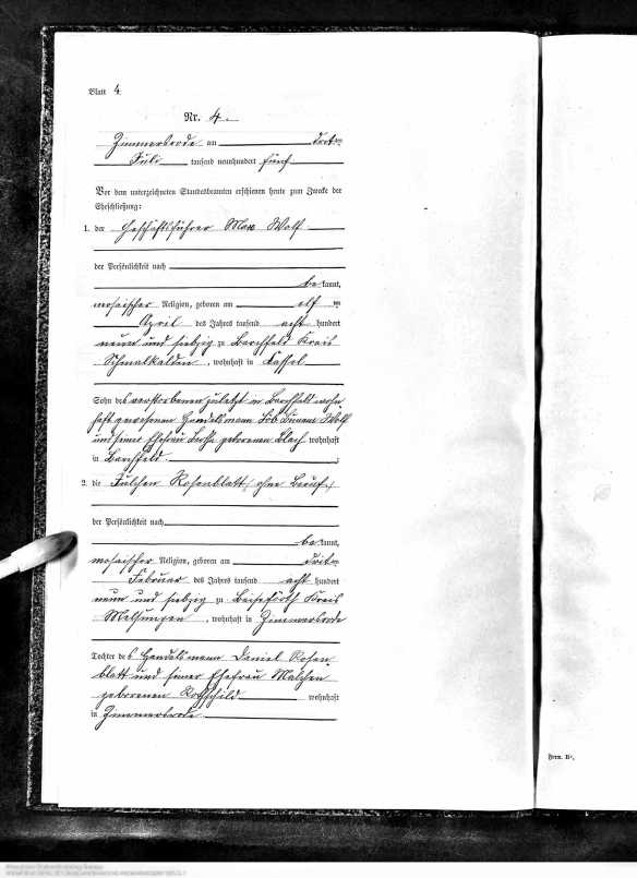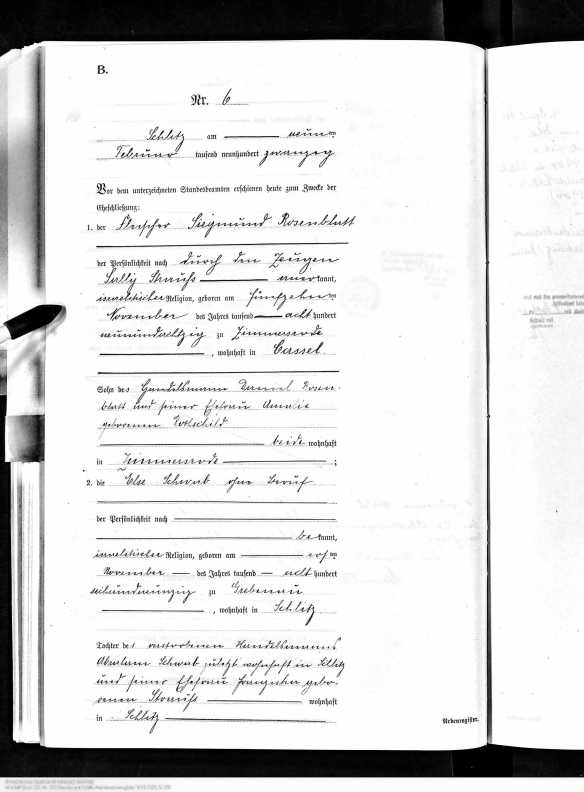 Julchen Rosenblatt and Max Wolf marriage record, Hessisches Hauptstaatsarchiv; Wiesbaden, Deutschland; Bestand: 920; Laufende Nummer: 9567, Year Range: 1905, Ancestry.com. Hesse, Germany, Marriages, 1849-1930