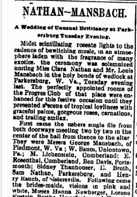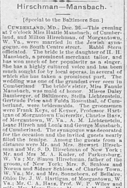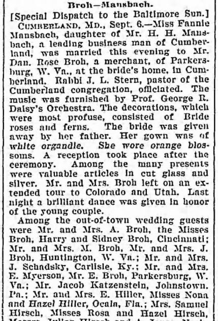 H.H. Mansbach, father of Louis, Charles, and George Mansbach, proprietors of “The Hub,” died this morning at 12:20 o’clock in the home of his son-in-law, D.R. Broh, 140 Main Street, Berkley ward. Mr. Mansbach was 72 years of age [sic: he was 71] and while he had been in failing health for more than a year, his death was unexpected and came as a shock to his family. Tomorrow evening on the Washington steamer his body will be conveyed to Cumberland, Md., where the funeral will be held and the deceased laid in his last resting place beside his wife, who preceded him to the grave about five and a half years ago. The body will be accompanied to Cumberland by the members of his family.