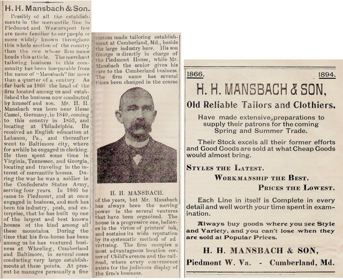 After the surrender of General Lee, Mr. Mansbach engaged in the mercantile business in Piedmont, W.Va., where he was a leading and very prosperous merchant for forty-one years, and up to the time of his retirement about five years ago, when he came to Norfolk and has since lived with his daughter, Mrs. D. R. Broh. He was one of the best known business men in West Virginia and was widely known throughout Virginia and Maryland.
