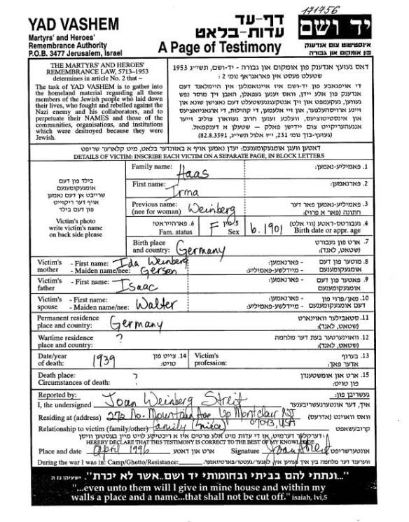 That brings me to Number 2, Laura Winter. I am assuming that Laura Winter was born Rosina Laura, a daughter of Hieronymous, and married a man named Winter. The document names a Frau Aennie Wiener as her next of kin and states that Laura and her husband also died in Luxembourg, reinforcing my assumption that she and Jacob were siblings. Aennie Wiener is listed as residing at 8409 Talbot Street, Kew Gardens, Long Island.