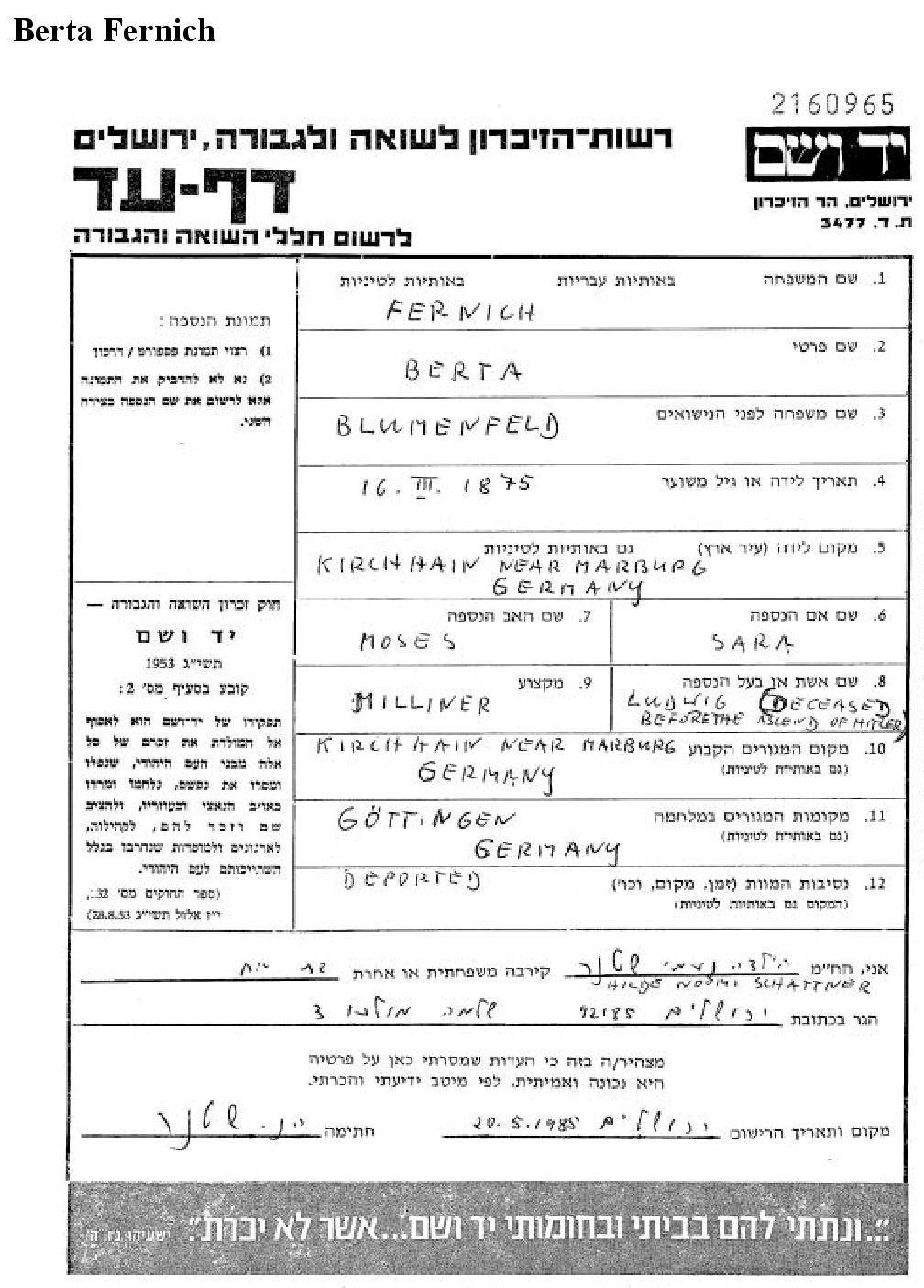 I also knew who Numbers 15 and 16 were: Emil and Eugen Seligmann were the sons of Carolina Seligmann, the half-sister of James, Bernard, and the others, and they were the grandsons of Moritz Seligmann and Eva Schoenfeld. Emil had died from heart disease in 1942, and Eugen had died at Thierenstadt concentration camp in 1942. Emil’s son also died during the Holocaust at Buchenwald in 1945. His daughter Christine was still alive in 1950 when this document was created.