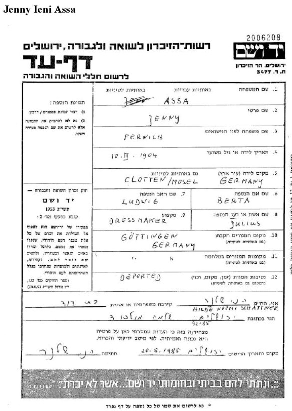 Number 6 is Wolfgang’s grandfather Julius, a son of August Seligmann and grandson of Moritz and Babetta. He was still alive in 1950. Number 7 is Moritz Seligmann, the brother of Julius about whom I wrote here. He had served in World War I for Germany and been awarded the Cross of Honor, but was nevertheless killed during the Holocaust. Number 8 is Franziska or Frances Seligmann Michel, the mother of Fred Michel, about whom I wrote here. She was also the child of August Seligmann and the granddaughter of Moritz and Babetta, and had died in 1933. Her son Fritz (Fred) is also mentioned on the heirs list.